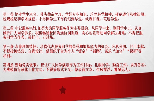 即便在学生会工作,我们依然还是学生,学习依旧是我们的本职工作,不能以学生会的工作为理由而耽误自己的学习。其次,学生工作以为学生服务为宗旨,全心全意为学院或学校的学生服务。不能只做表面功夫,要脚踏实地,求真务实地完成学生工作。