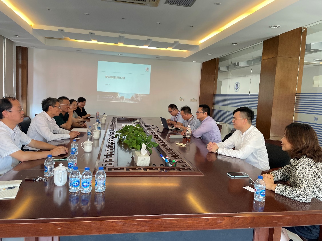 袁春平副院长介绍了医药前沿技术研究院以及上海药物制剂智能装备工程技术研究中心的建设情况和发展定位,并介绍了具体的可合作领域。单宏丽副院长介绍了医药前沿技术研究院最近获批立项的上海市心脑血管非编码RNA成药性前沿科学研究基地情况。刘余敏厂长介绍了公司的基本情况和今后的发展愿景。双方进行了友好热烈的交流,一致同意开展战略合作,并初步达成了合作项目的意向。随后大家参观了公司的质检部、提取车间、制剂车间。