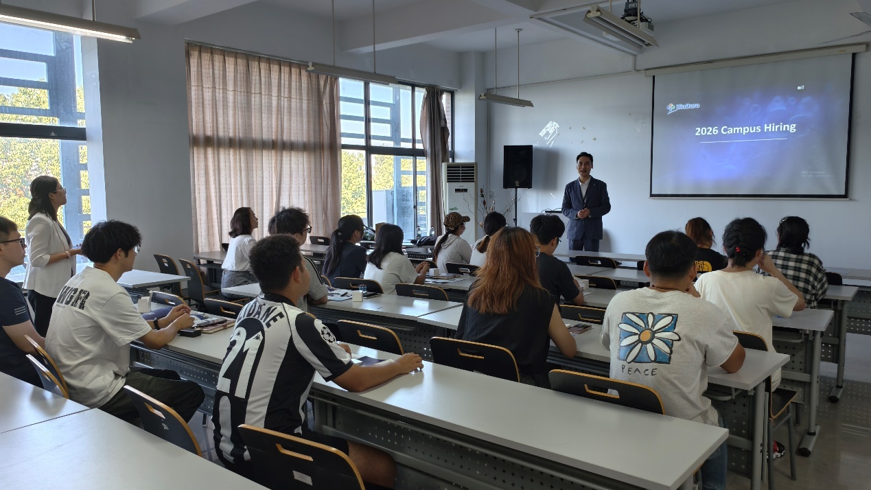 宣讲会现场,李总首先围绕行业发展趋势、人才需求结构及职业发展前景等内容进行了深入解读,为同学们把握市场脉搏、明晰职业定位提供了权威指导。随后,代表通过详实的PPT展示,系统介绍了保诺桑迪亚的发展历程、企业理念、业务布局、技术优势以及2026届招聘计划,并就同学们关心的岗位职责、培训体系与职业发展路径作了重点说明。