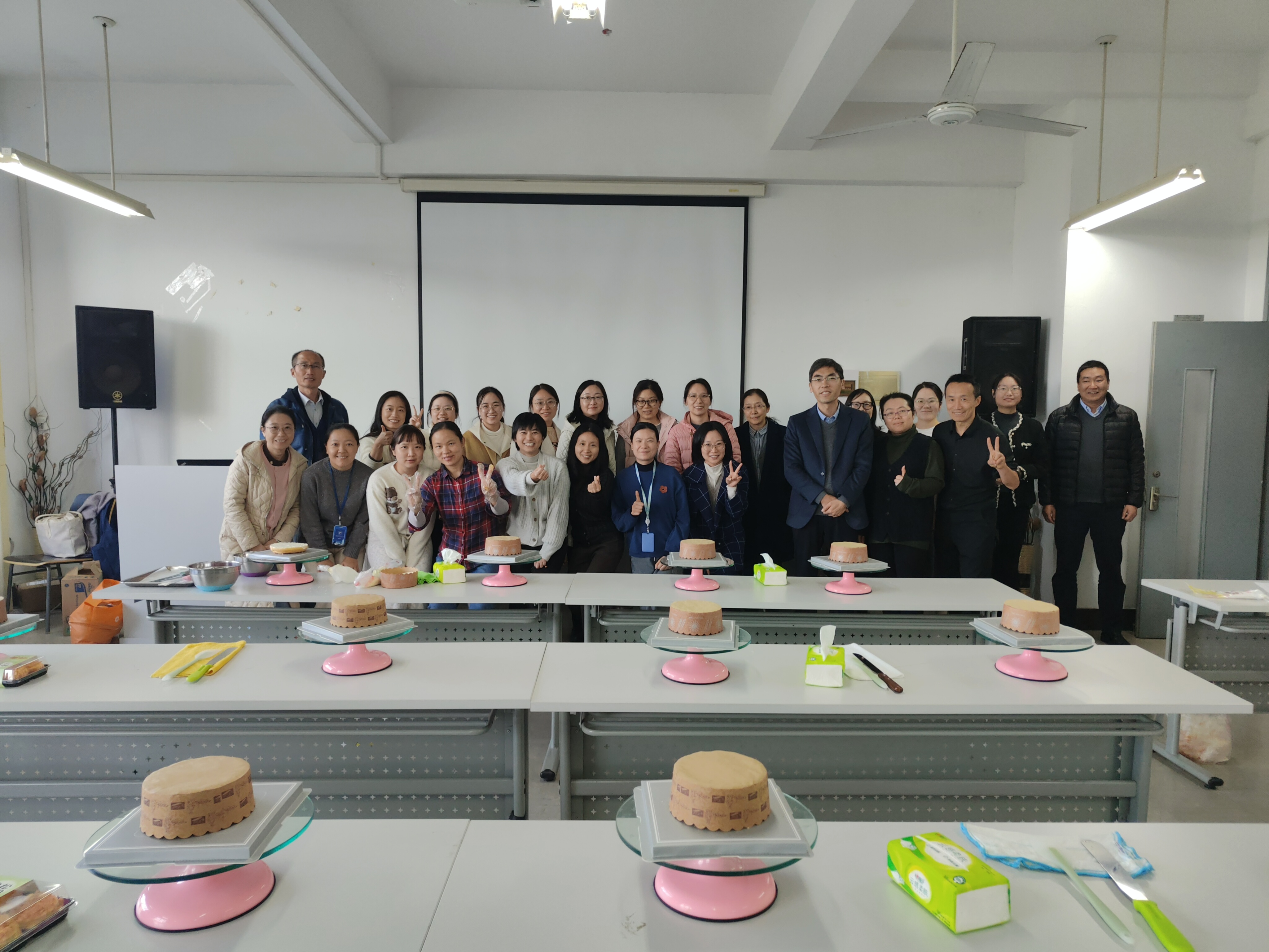 专业烘焙师现场指导,女教师们化身“甜点师”。从称量配料、打发奶油到裱花装饰,大家分组协作,时而交流烘焙心得,时而互相帮助解决操作难题。实验室的严谨与烘焙的创意碰撞出别样火花:有小组设计“拉布布蛋糕”造型,将流行特色融入甜品;更有小组创作“五彩缤纷”糖霜图案。实训中心4418变身“甜蜜工坊”,笑声与赞叹声此起彼伏。