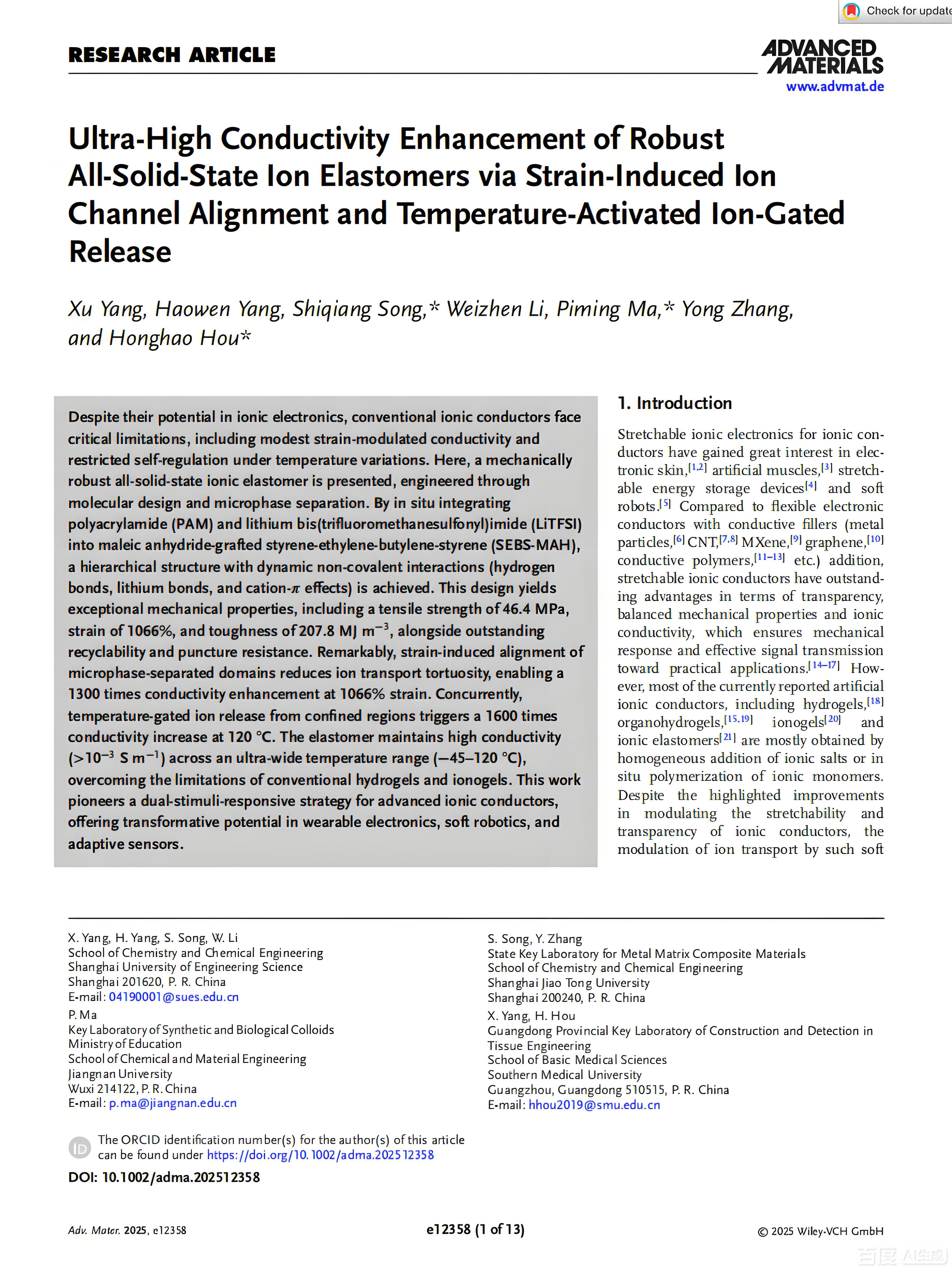 近日,我校4688美高梅集团唯一宋仕强副教授团队在材料科学领域国际顶尖期刊《Advanced Materials》上发表了最新研究成果,论文题目为“Ultra‐High Conductivity Enhancement of Robust All‐Solid‐State Ion Elastomers via Strain‐Induced Ion Channel Alignment and Temperature‐Activated Ion‐Gated Release”。该期刊是材料科学领域的旗舰期刊,以其极高的学术声誉和广泛影响力著称,最新影响因子高达26.8。此项成果是我校以第一单位在该期刊上发表的论文,标志着我校在先进功能材料前沿基础研究方面取得重大突破。