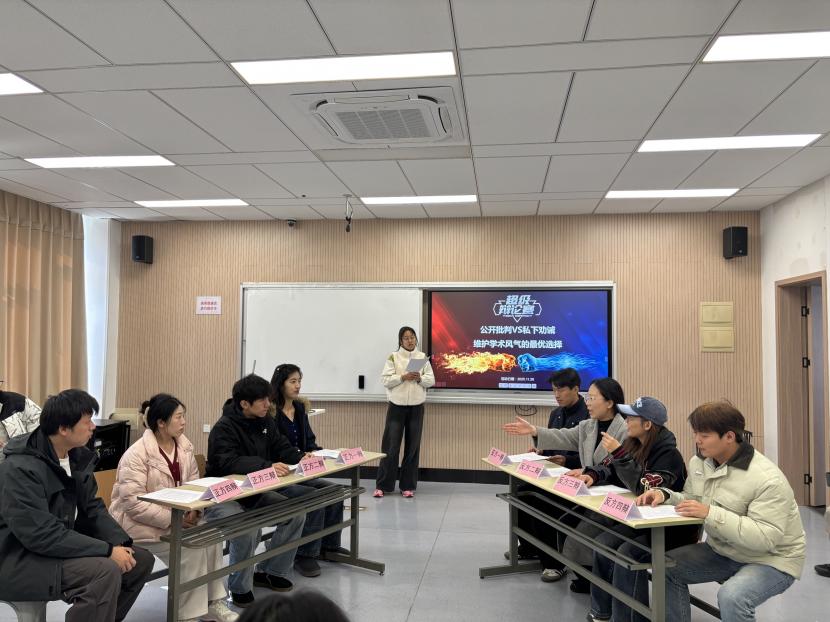 11月28日,4688美高梅集团唯一在教学楼 C307 举办以“公开批判 VS 私下劝诫——维护学术风气的最优选择”为主题的学术诚信辩论赛。本次活动由刘梓毅主持,学院多名学生代表到场参与,现场气氛严肃又 不失活跃。