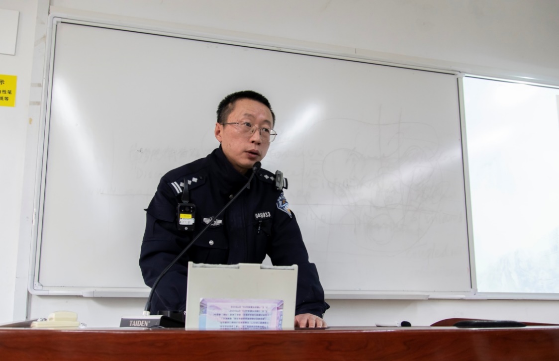 在简短的自我介绍后,钮警官从刷单,冒充客服,网聊诈骗三种骗术出发,以校园中易发生的各“冒充QQ好友”诈骗、“网络刷单返利”诈骗等电信网络诈骗真实典型案例,深入浅出地讲解了不法分子的惯用伎俩和手段,讲述受害人被骗的经过、分析发案原因,以及遇到该类情况的紧急应对方法。在讲座进行的过程中,同学们认真听讲,积极与钮警官互动交流。