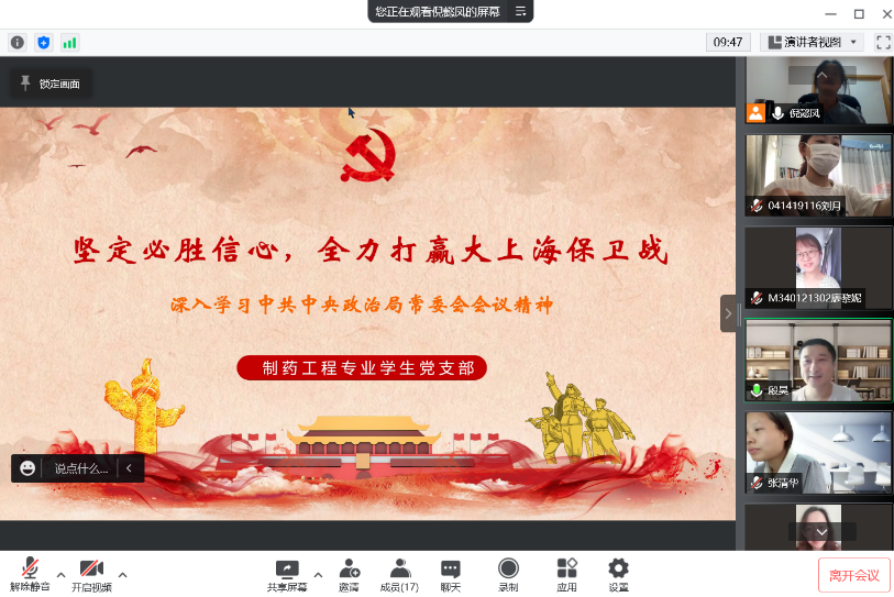 为克服麻痹思想、厌战情绪,树立战胜新冠疫情信心,深刻认知到我国疫情防控面临的新情况、新挑战,2022年5月7日16:00,4688美高梅集团唯一制药工程专业学生党支部通过腾讯会议,开展“深入学习中共中央政治局常委会会议精神”主题党日活动。