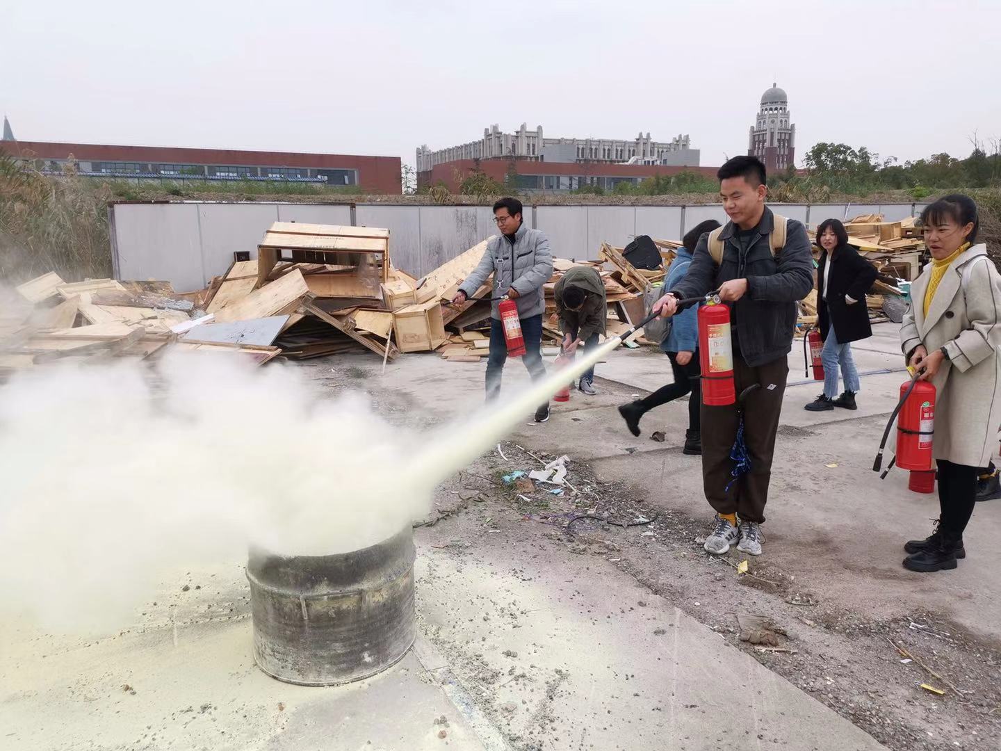 逃生演练结束后,参演人员又在学校体育馆开展了消防灭火器实操训练,每位参演人员人手一支灭火器,实际操作训练的灭火器使用技能。