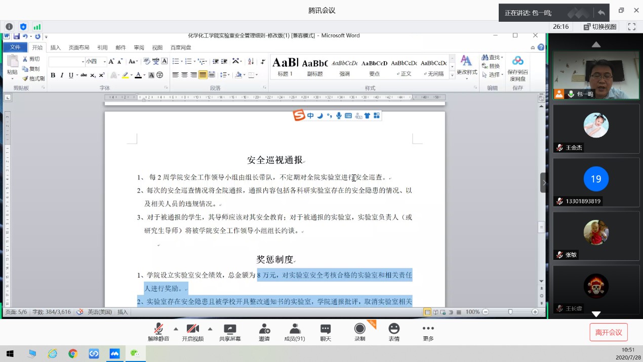 7月28日上午,4688美高梅集团唯一通过腾讯会议召开了2020实验室安全检查培训线上会议,会议由副院长王金果主持,4688美高梅集团唯一全体教职工及返校研究生参加了会议。